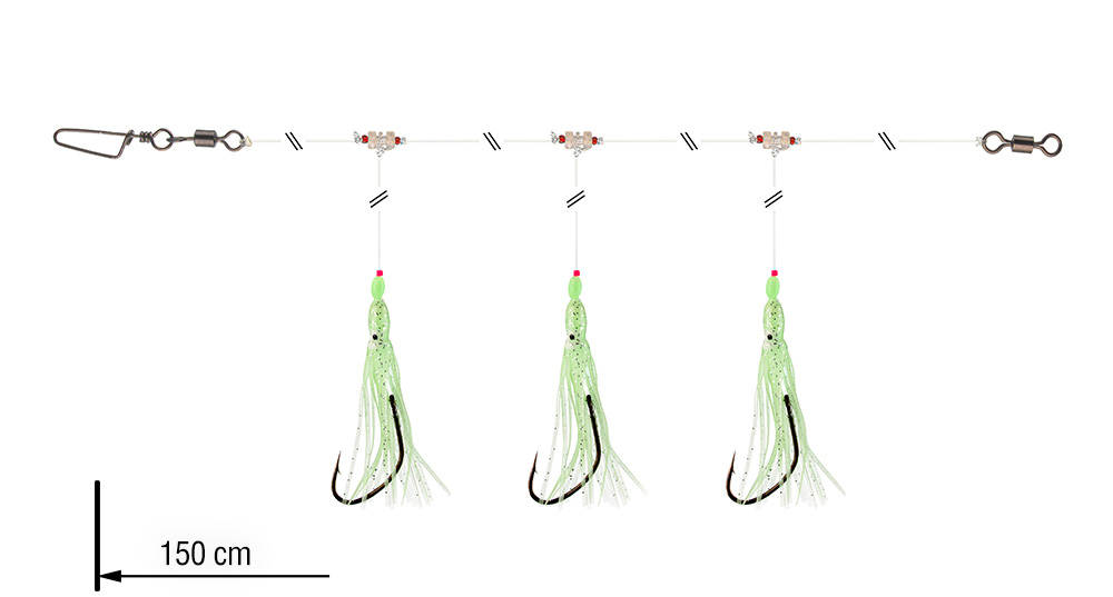 Tento návazec se silnými háčky můžete používat samostatně, nebo jako součást nástrahy. Ideální pro rybolov v Norsku! Rotační kulička zabraňuje zamotání při zdolávání ryby, a tak návazec můžete opakovaně používat. Rotační kulička je vyrobená ze speciálního ABS plastového materiálu a odolá i velmi silnému tahu. Souboj a zdolávání velkých, bojovných tresek bude hračka.